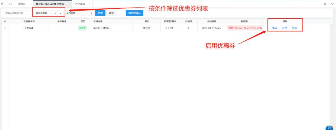 回到优惠券列表,点击启用对应优惠券,门店结算的时候系统会自动计算优惠。