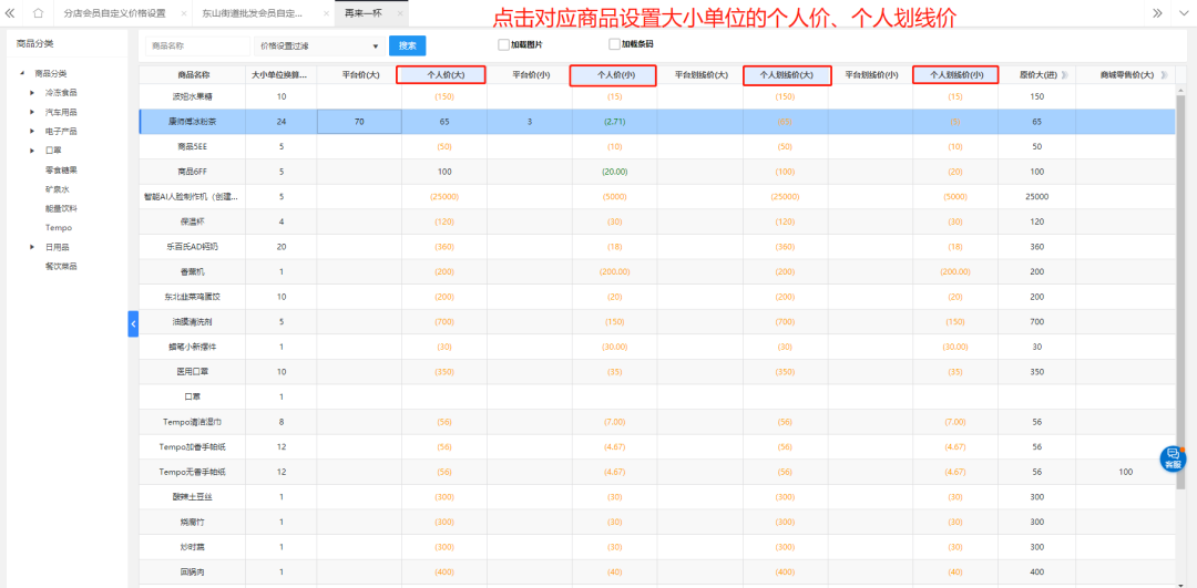 点击对应商品设置大小单位的会员个人价、个人划线价。