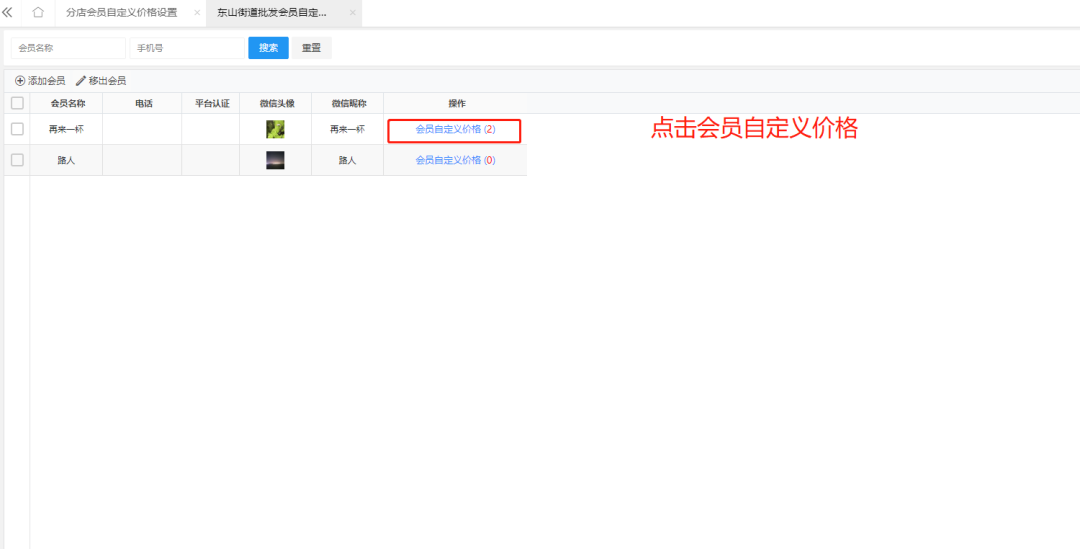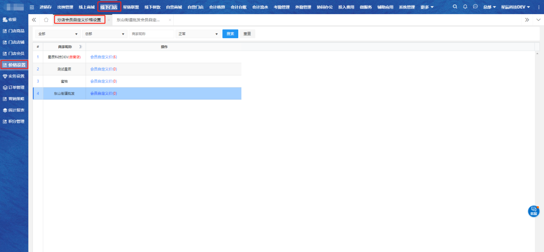 进入分店会员自定义价格设置页面,选择对应分店,