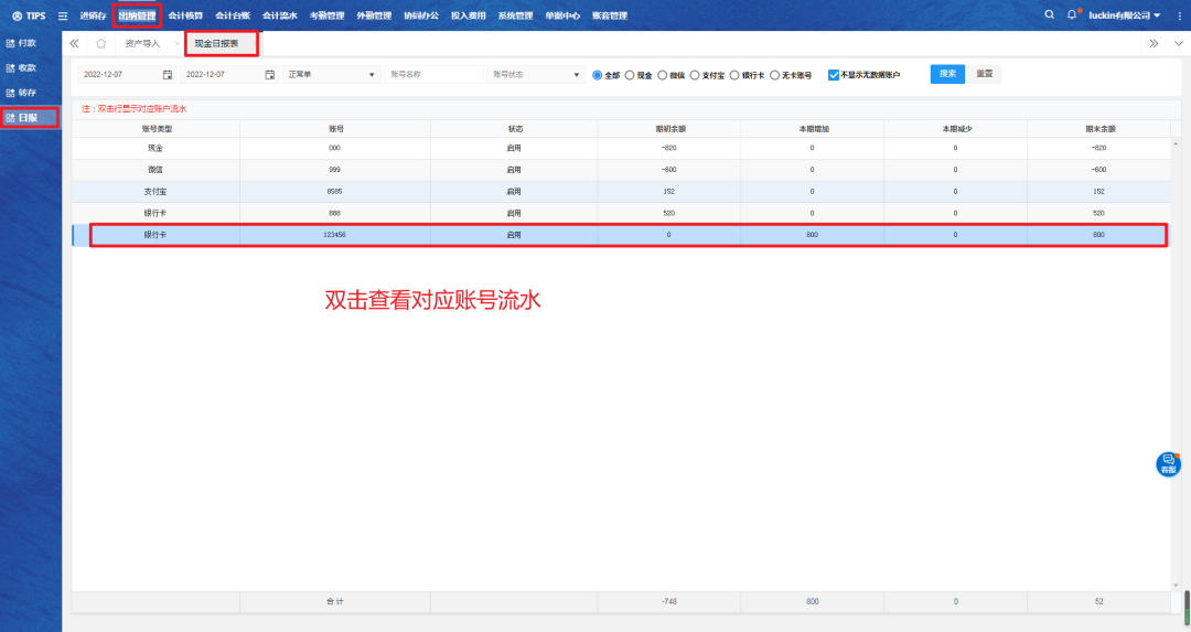 △进入【出纳管理】-【日报】-【现金日报表】选择对应账号类型,双击行显示对应账户流水。