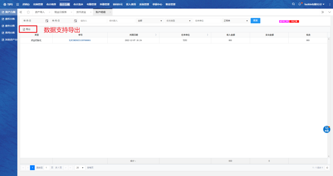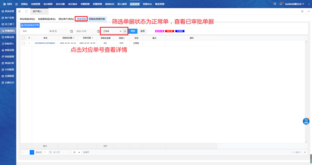 三、回到资金初始页面,筛选单据状态为正常单,查看对应单据详情。