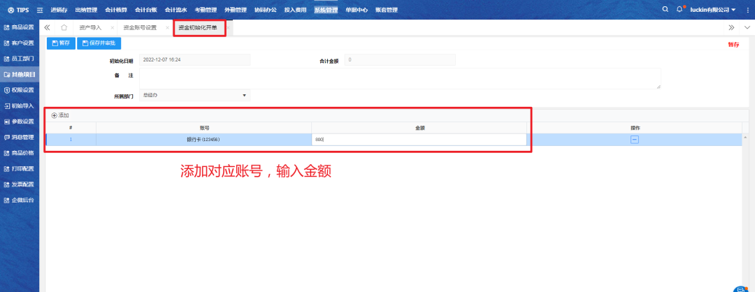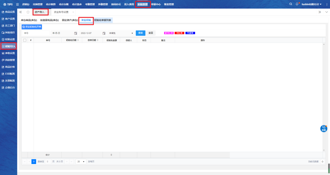 资金初始化开单