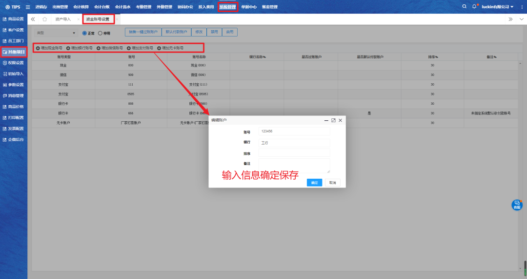 一、进入【系统管理】-【其他项目】-【资金账号设置】,添加资金账号,输入信息确定保存。