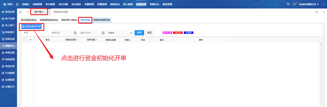 一、进入资金初始页面,点击按钮进行资金初始化开单;