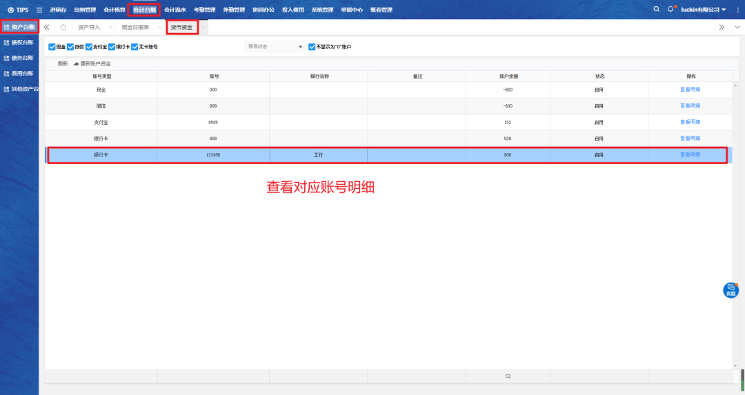 △进入【会计台账】-【资产台账】-【货币资金】,选择对应账号查看明细;