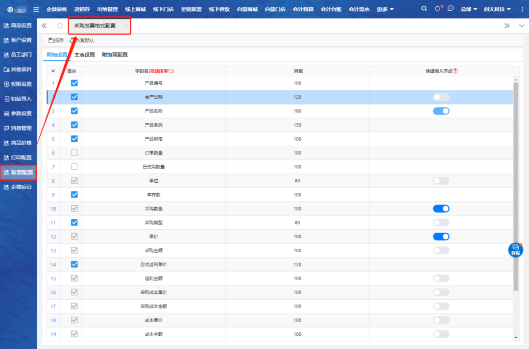 “发票配置”功能包含了采购发票格式配置、销售订单配置和销售发票格式配置。采购发票格式配置涵盖了采购开单所需的各方面的内容,如采购数量、采购类型、单价、返利金额、批次、生产日期、库存数等等。各项应填明细内容可以拖动排序,有效规范统一了销售发票内容。