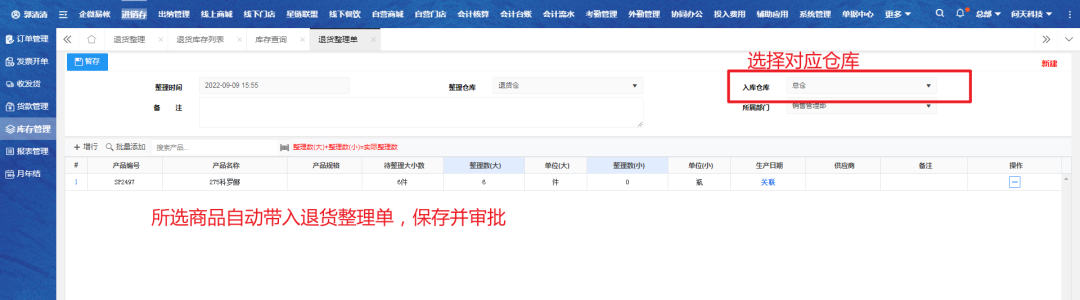 所选商品自动代入退货整理单,填写完其他信息保存并审批。