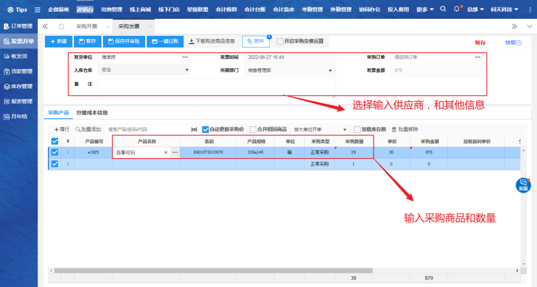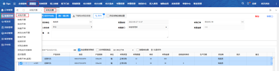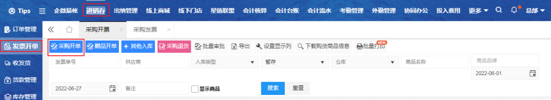 电脑端入口:【进销存】-【发票开单】-【采购开票】