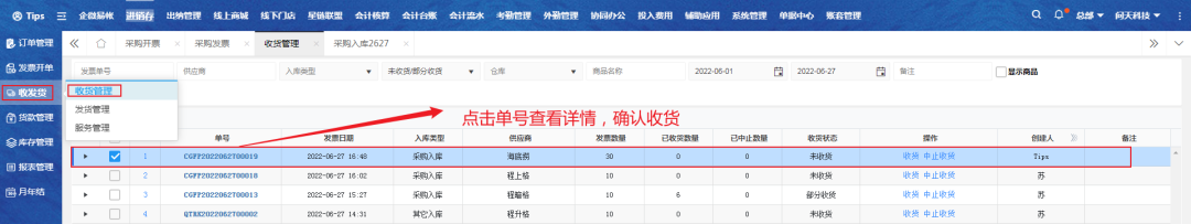 二、进入收货管理页面,点击对应单号查看详情;