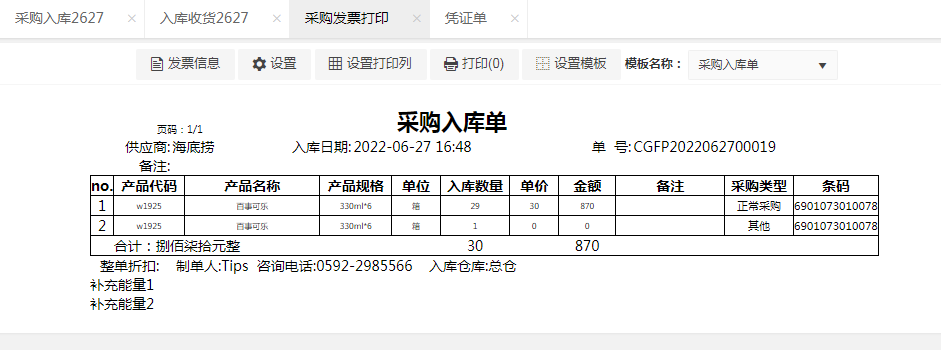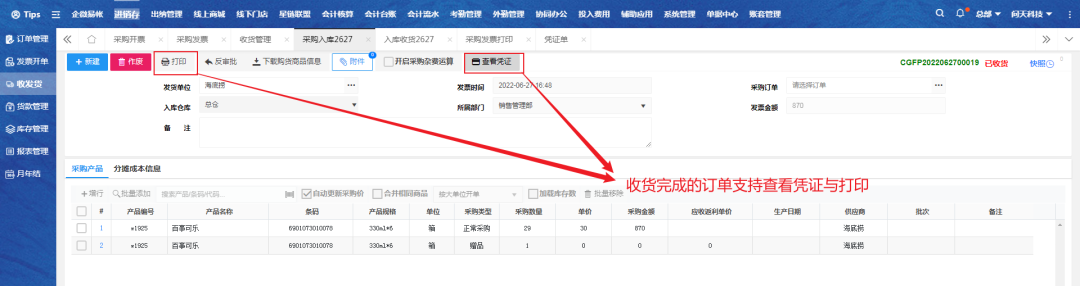 收货完成的订单支持查看凭证与打印。
