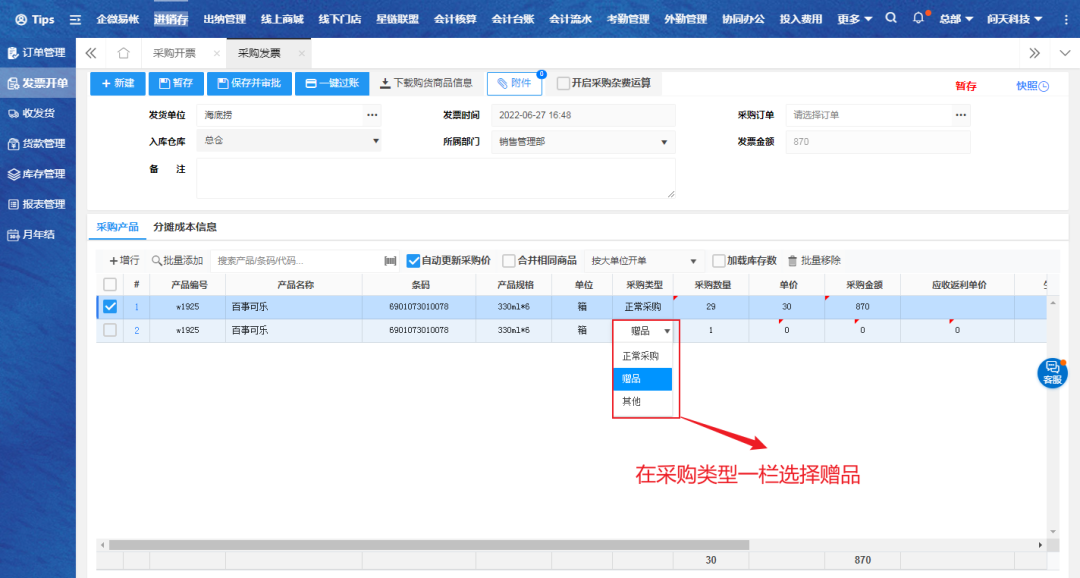 添加赠品,在采购类型一栏选择赠品;