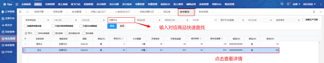三、进入库存查询页面,输入对应商品快速查找;