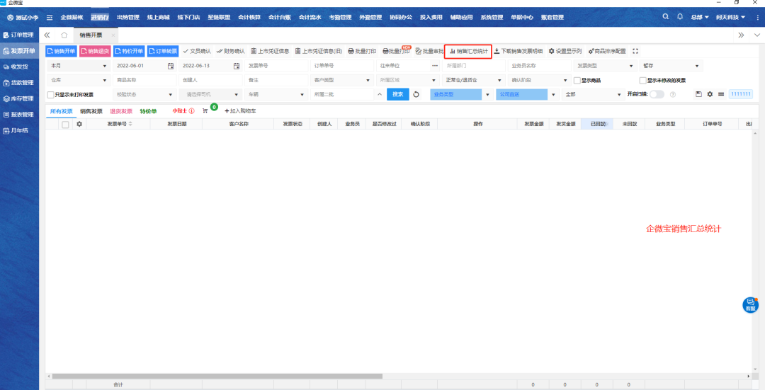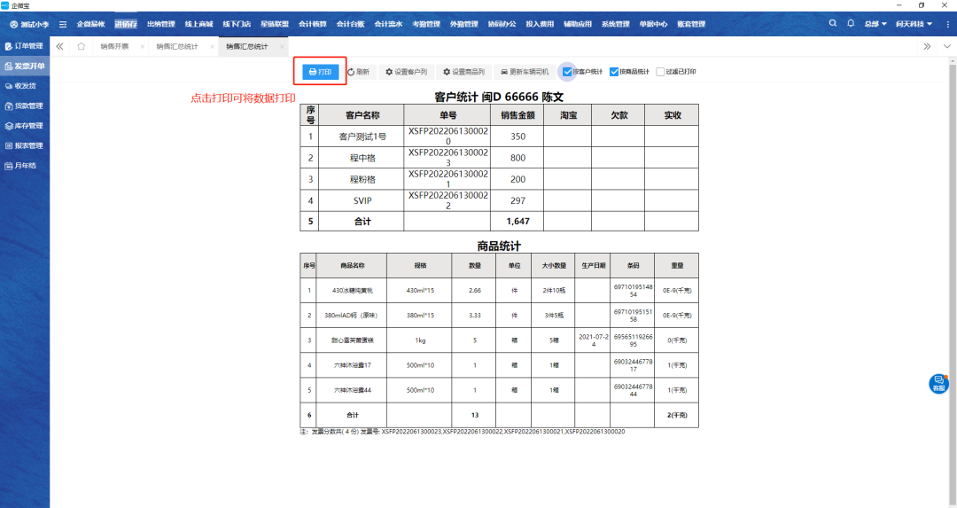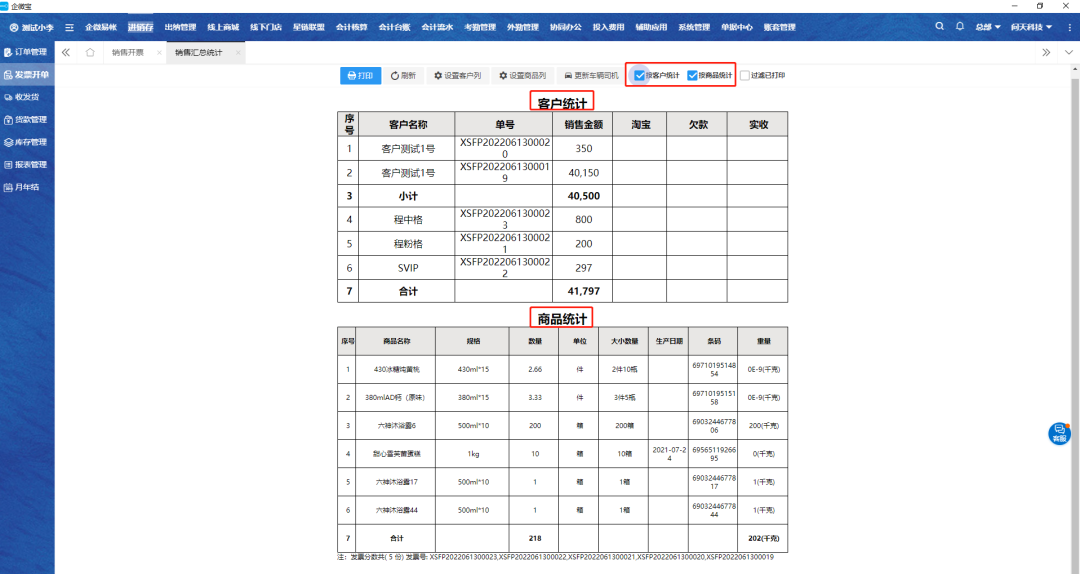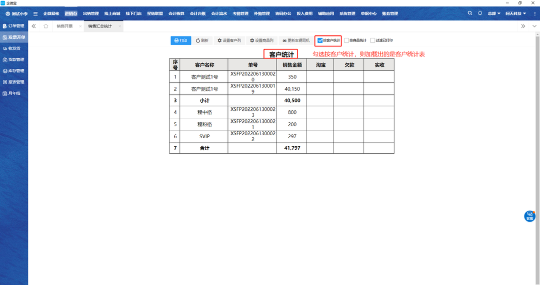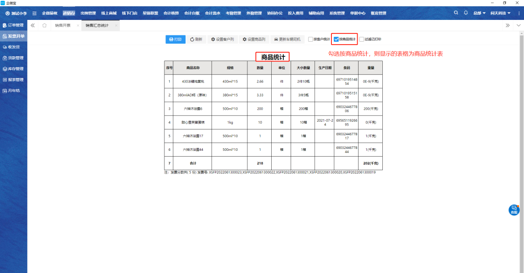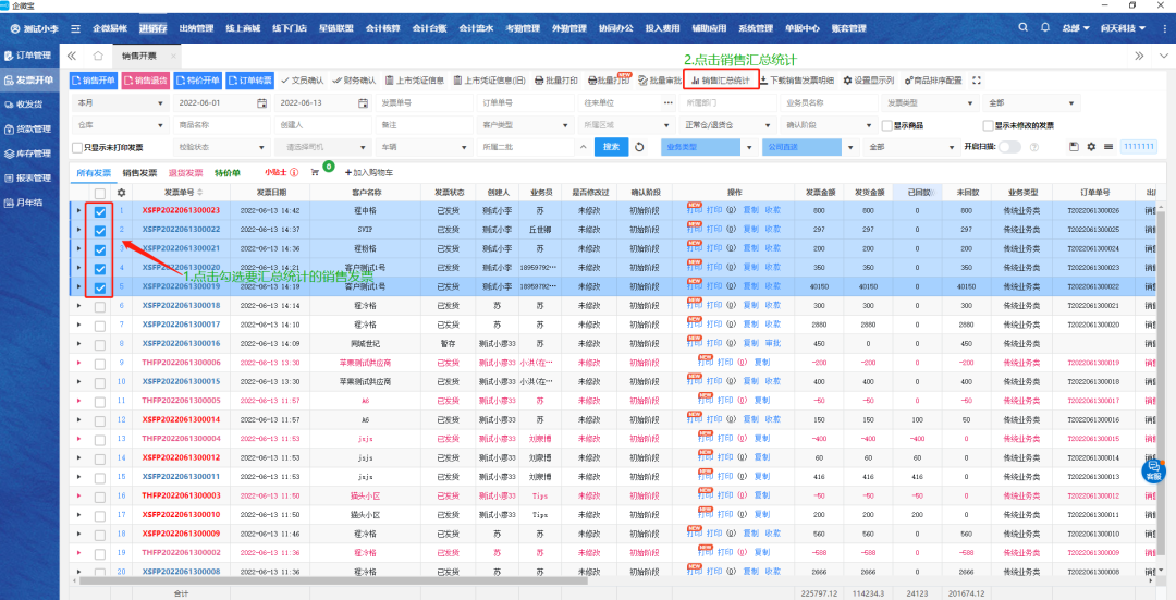 2.勾选要操作的销售单,点击销售汇总统计