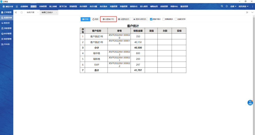 注:如图案例所示,点击设置客户列可以自定义客户统计表头标题