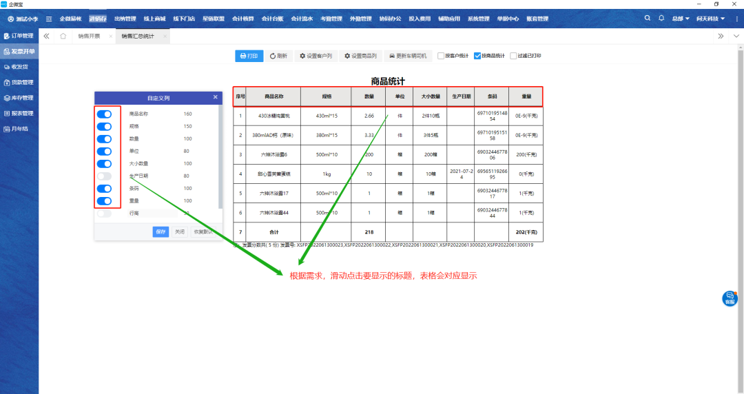 注:如图案例所示,点击设置商品列可以自定义商品统计表头标题