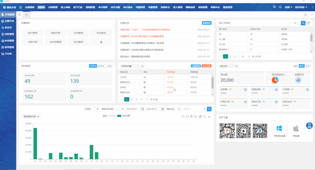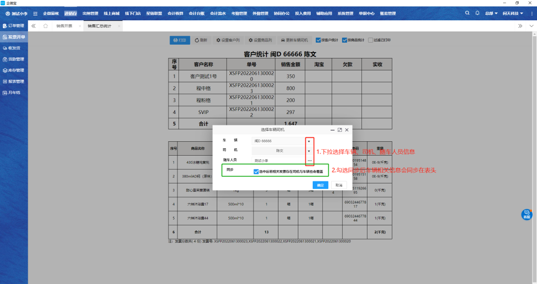 企微宝的【销售开票】模块,可以通过自定义选择销售单,按照商品、客户分类统计查询,支持数据批量打印导出。并新增【更新车辆司机】功能,可以显示进行车辆、司机、随车人员的信息,配货员在打印销售发票单之前,就可以分配多张配货单给同一司机和车辆。