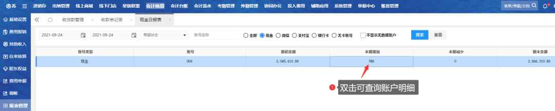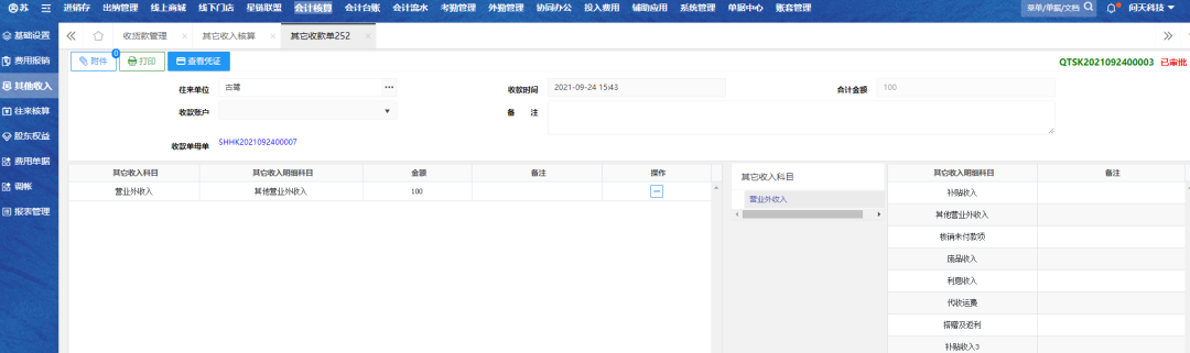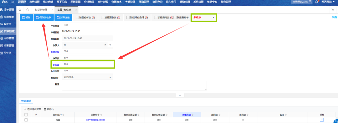 概况 在收款过程中有一种零头抹平功能,在收款时创建少收款抵扣额将尾数去除,使客户更便捷收款抵扣费用单,同时也支持多收款功能。 少收款概述 收款单运用少收款功能,则在【自营固定费用】会对应生成一单抵扣的固定费用单。 少收款功能 进入收款单:在列表页点击“收款”按钮 图1 创建少收款:选择“少收款”,填写“少收款金额”,选择收款账户,保存并收款 图2 查资金明细:去【现金日报表】查询该收款单的资金明细 图3 固定费用单:去【自营固定费用-付款单记录】查询少收款的抵扣固定费用单 图4-1 图4-2 多收款概述 收款单运用多收款功能,则在【其它收入核算】会对应生成一单其它收款单 多收款功能 创建多收款:选择“多收款”,填写“多收款金额”,选择收款账户,保存并收款 图5 查资金明细:去【现金日报表】查询该收款单的资金明细 图6 其它收款单:去【其它收款核算】查询多收款的其它收款单 图7-1 图7-2