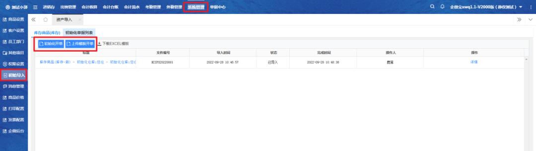 在【系统管理-初始导入-资产导入】使用该功能快捷的录入商品库存和对应的成本,保存及完成库存以及成本的初始化。
