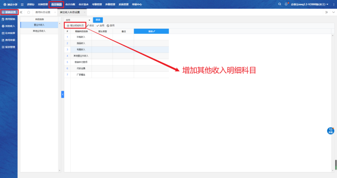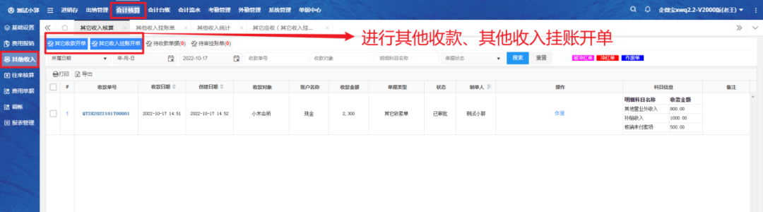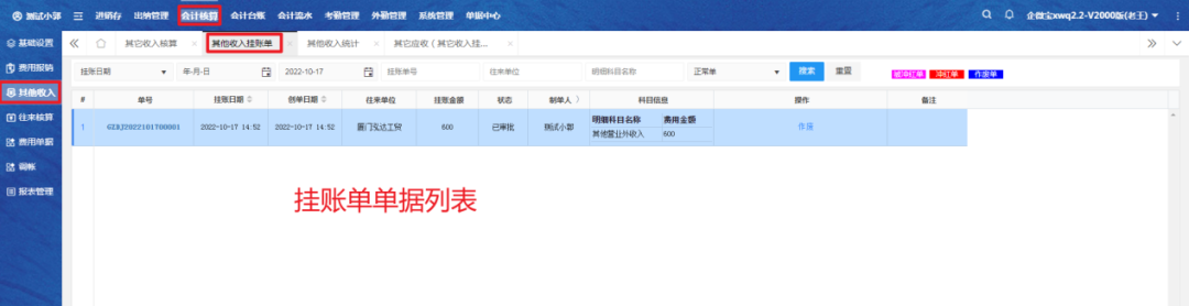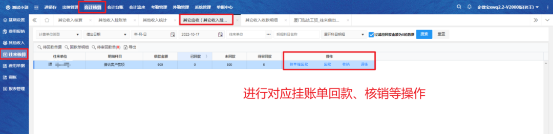 其他收入挂账单开单后,进入【会计核算-其他收入-其他应收(其他收入挂账)】进行回款、调账、核销等操作。
