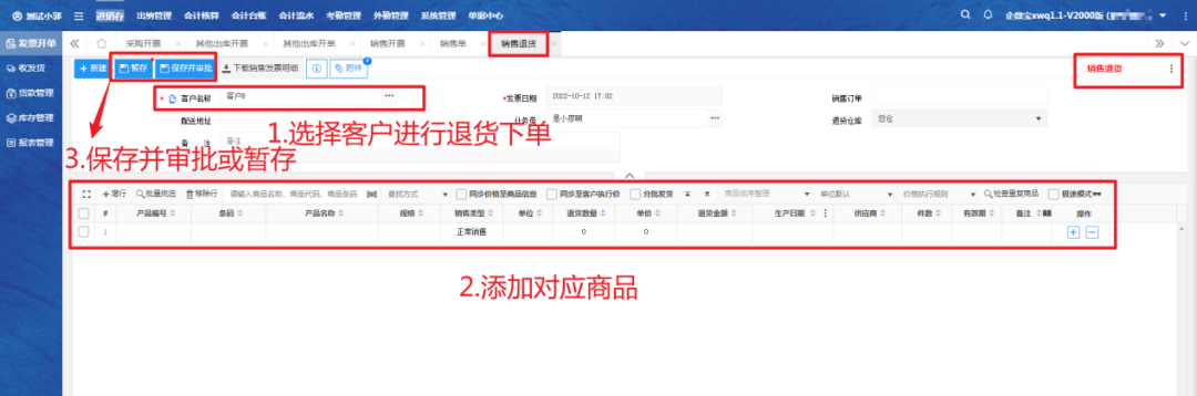 进入销售退货页面,选择对应客户、商品进行下单退货,暂存或保存并审批。