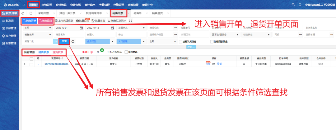 在【进销存-发票开单-销售开票】进行开单,销售发票在列表可按条件筛选查看。
