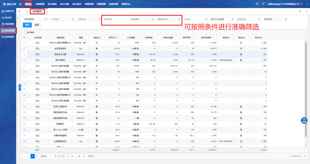 在【进销存-库存管理-库存查询】,可按照仓库、商品分类进行条件筛选,准确快速查找对应商品库存。