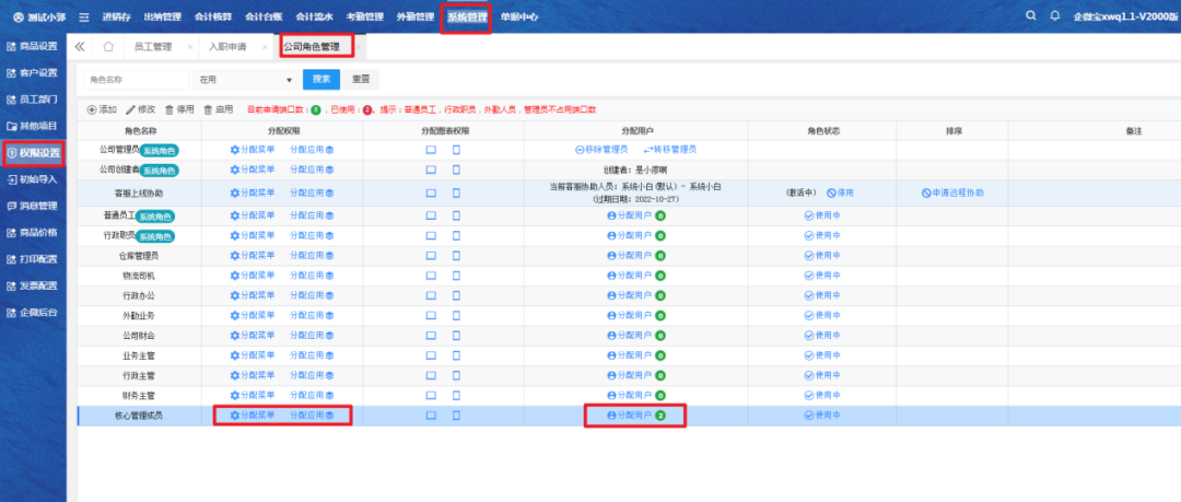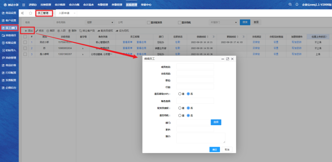 (2)管理员在电脑端【系统管理-员工部门-员工管理】进行添加员工及角色管理;在【系统管理-员工部门-部门管理】分配员工至部门,设置部门可操作权限。具体操作详见企微社区,搜索关键字查看。