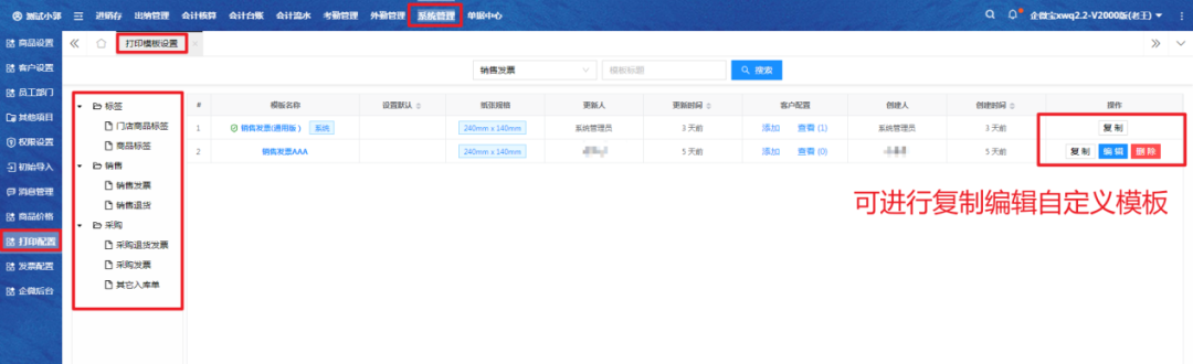 在【系统管理-打印配置-打印模板设置】,进行复制编辑自定义模板。