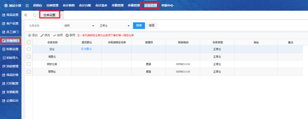 在【系统管理-其他项目-仓库设置】进行仓库信息维护,具体操作详见企微社区,搜索关键字查看。