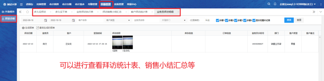 在【外勤管理-拜访分析】进行查看业务员拜访明细、拜访销售小结汇总等等。