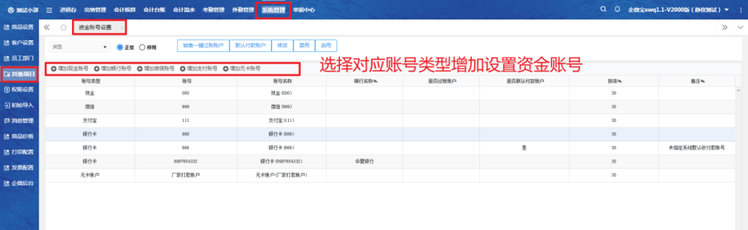 在【系统管理-其他项目-资金账号设置】进行管理多类型资金账号。