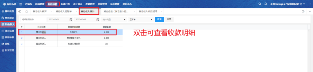 根据待其他收入的科目明细进行归类,双击可查看该科目的收款明细。