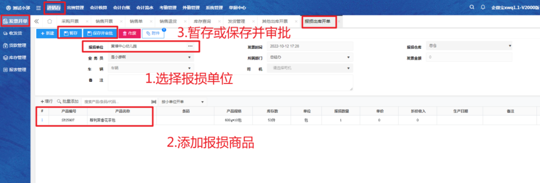 进入报损开单页面,选择对应客户、商品进行报损开单,暂存或保存并审批。