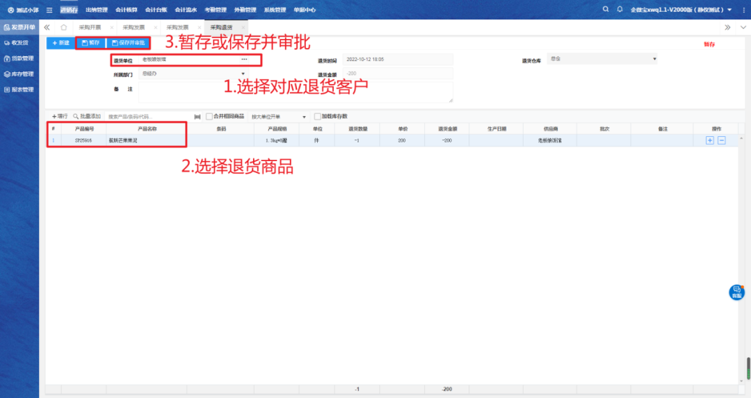 进入采购退货页面,选择对应客户、商品进行退货下单,暂存或保存并审批。