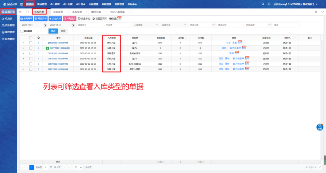 在【进销存-发票开单-采购开票】进行开单,可在列表按条件筛选查看单据。