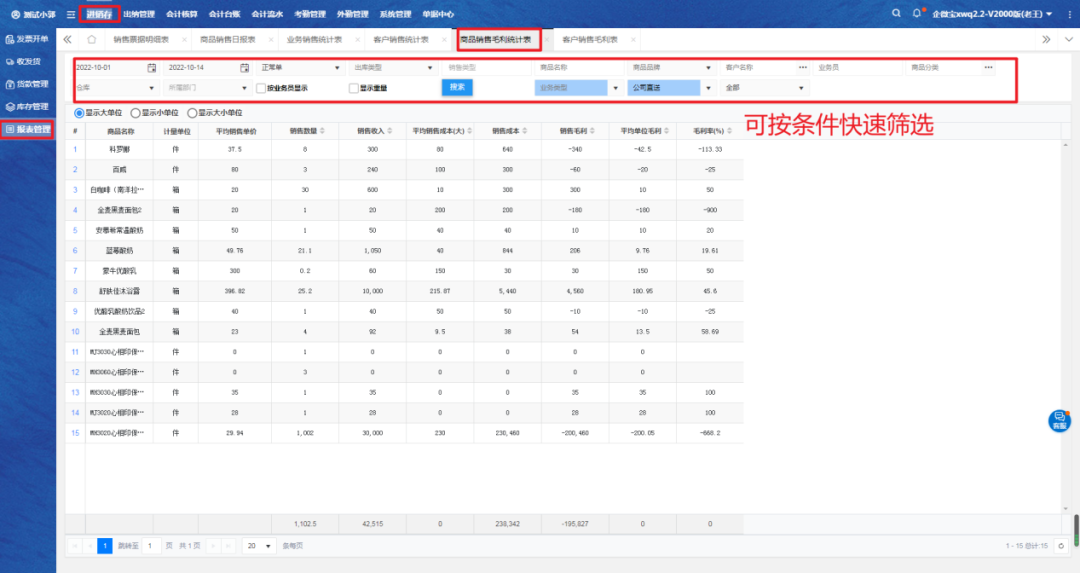 在【进销存-报表管理】中,可按条件进行筛选所需要查看的数据。具体操作详见企微社区,搜索关键字查看。