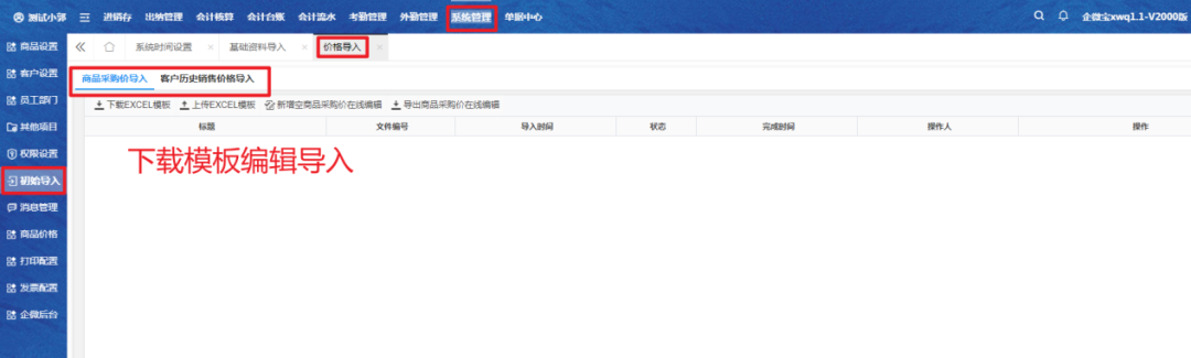 在【系统管理-初始导入-价格导入】进行下载模板批量导入。