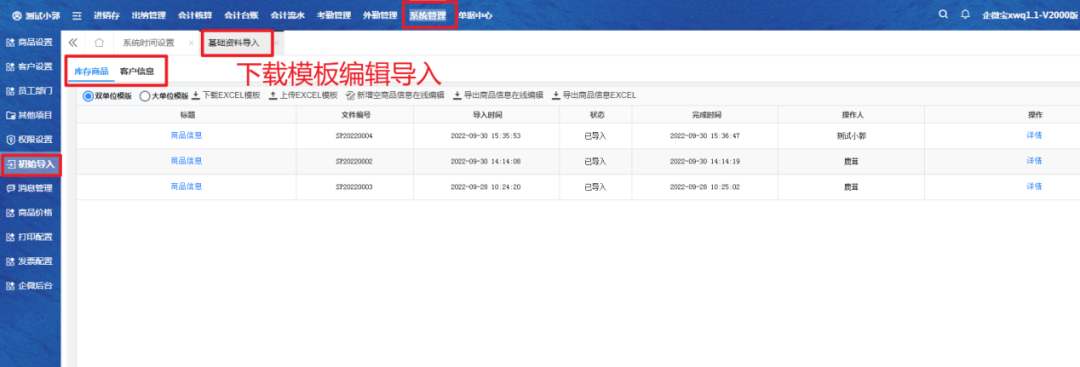 在【系统管理-初始导入-基础资料导入】进行库存商品信息、客户信息的批量导入。