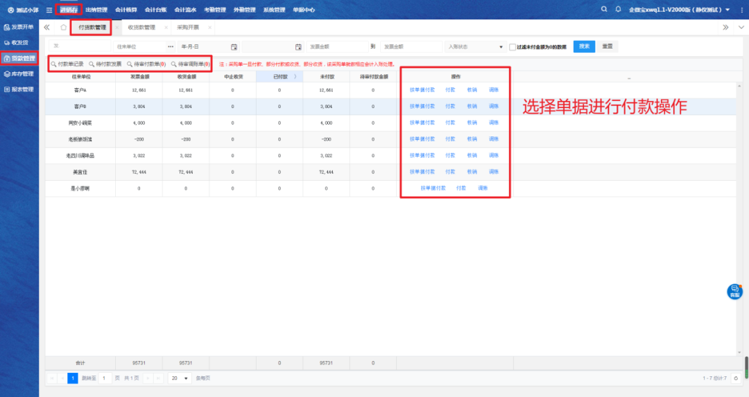 在【进销存-货款管理-付货款管理】,针对采购等订单所发生的付款、核销、调账、付款记录等等功能的管理。