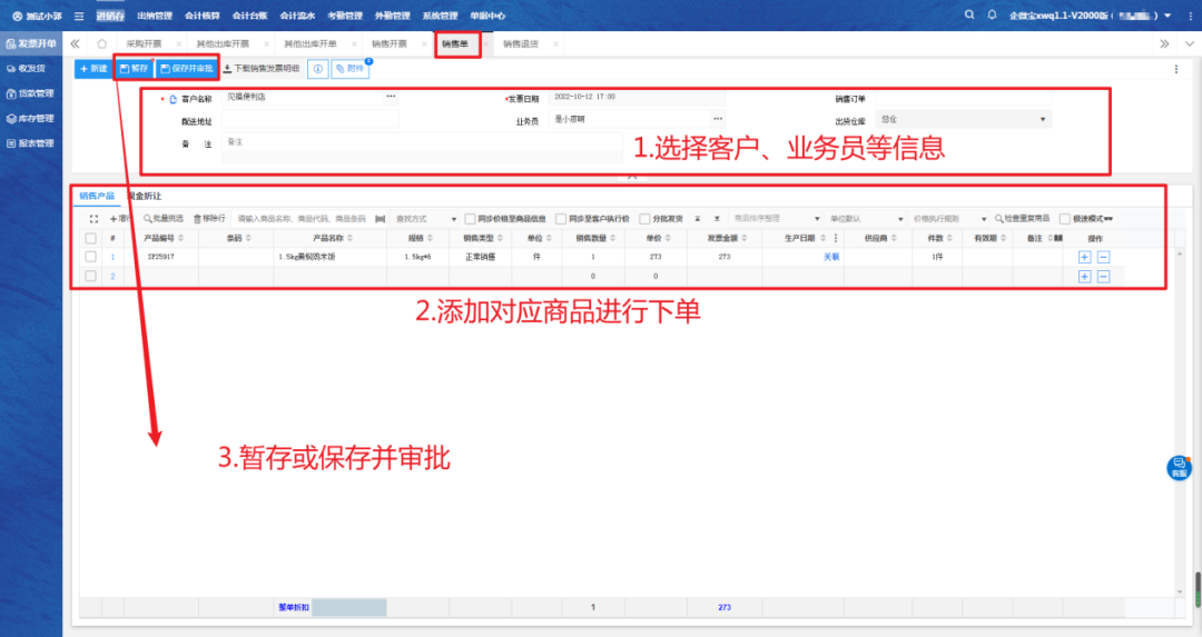 进入销售开单页面,选择对应客户、商品进行下单,暂存或保存并审批。