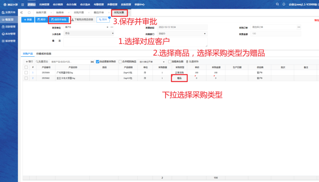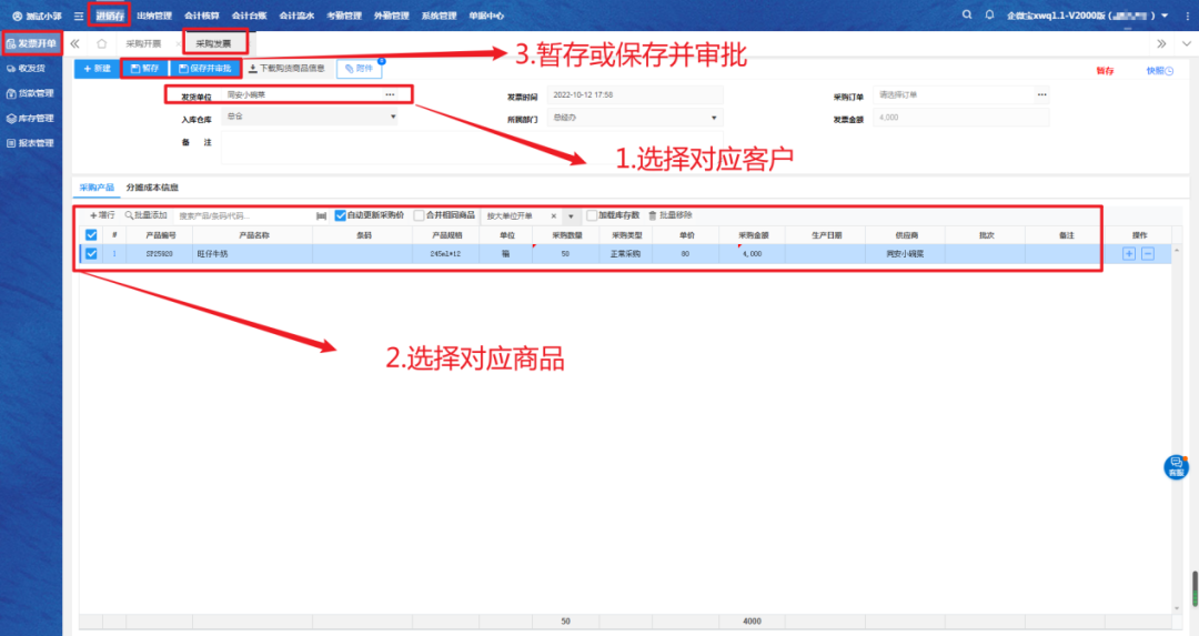 进入采购开单页面,选择对应客户、商品进行采购,暂存或保存并审批。
