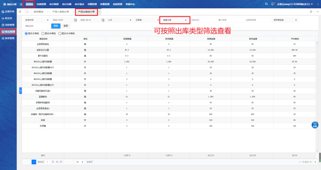 在【进销存-库存管理-产品出库统计表】,可按照出库类型进行条件筛选,查看一段时期内的商品出库总量和详情。