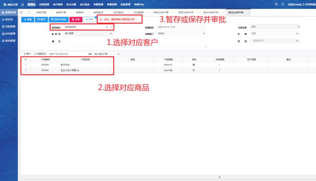 进入其他出库开单页面,选择对应客户、商品进行其他费用型(如:样品、赠品)出库开单,暂存或保存并审批。