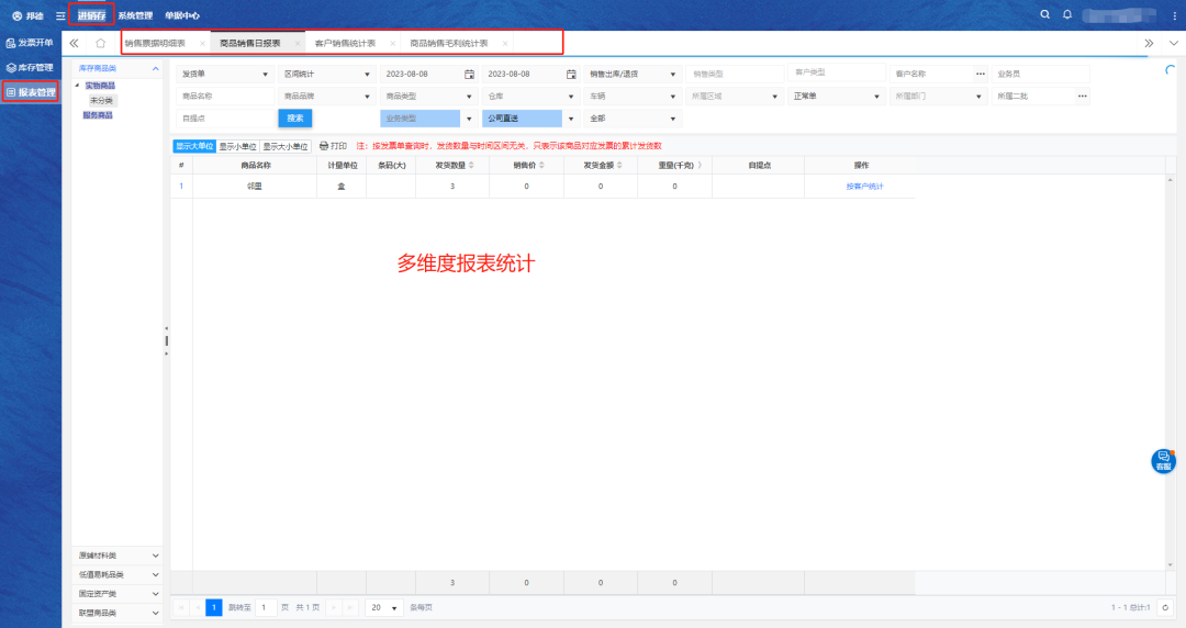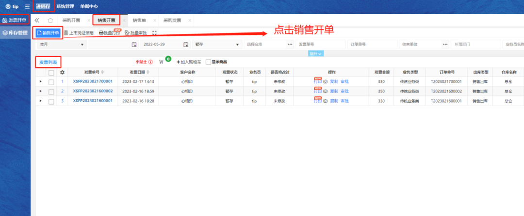 在【进销存-发票开单-销售开票】进行开单,销售发票在列表可按条件筛选查看。