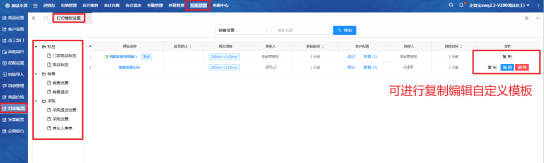 业务员可根据商户的特点、商品的类型进行提前设置通用模板,可以契合单据类型一键打印,无需每次手动修改,节省业务凭证打印时间从而提高工作效率。在【系统管理-打印配置-打印模板设置】,进行复制编辑自定义模板。具体操作详见企微社区,搜索关键字查看。