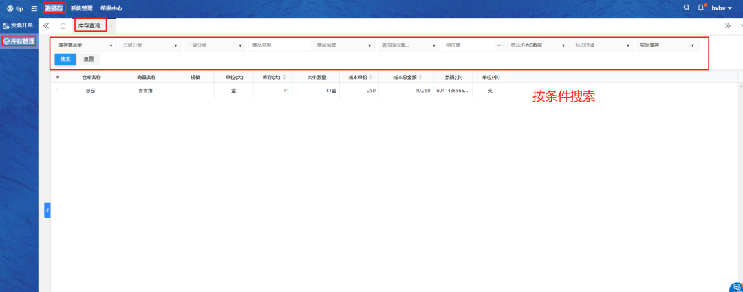 在【进销存-库存管理-库存查询】,可按照仓库、商品分类进行条件筛选,准确快速查找对应商品库存。