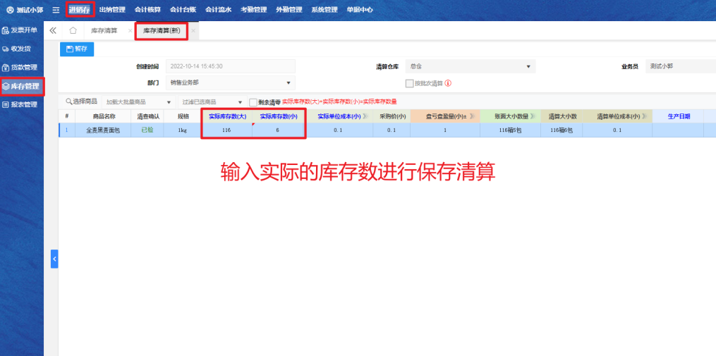 进入库存清算页面,输入清查确认后实际的库存数并保存。