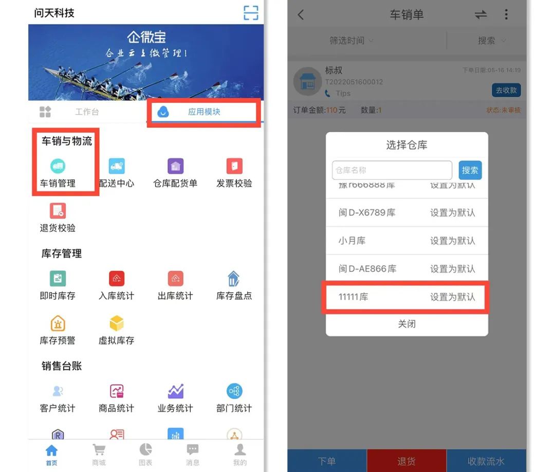 不仅是车销配货,企微宝ERP进销存系统从根源上、从各个方面着手解决车销管理问题。企微宝ERP进销存系统设置了针对车销管理的有效可行的功能模块——支持在线批量选货、销售记录实时更新、自动生成款项单据、剩余货品一键回库、在外实现发票打印等等,能在减少大量的人力资源成本浪费的同时,又提高整体的工作效率。