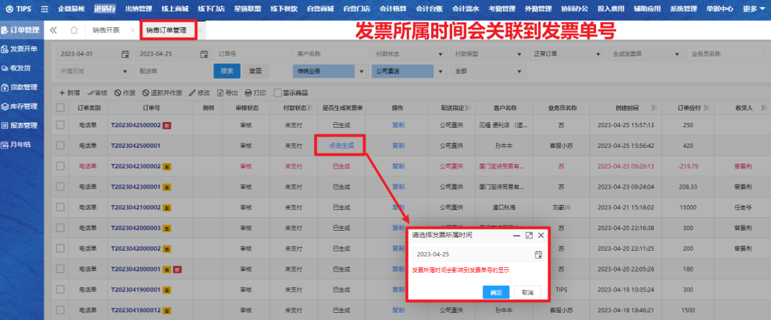 进入【进销存】-【订单管理】-【销售订单管理】页面,点击生成发票单,生成发票单时会弹出一个窗口,默认生成的发票日期为当天,支持手动选择修改日期,发票所属时间会关联到发票单号。