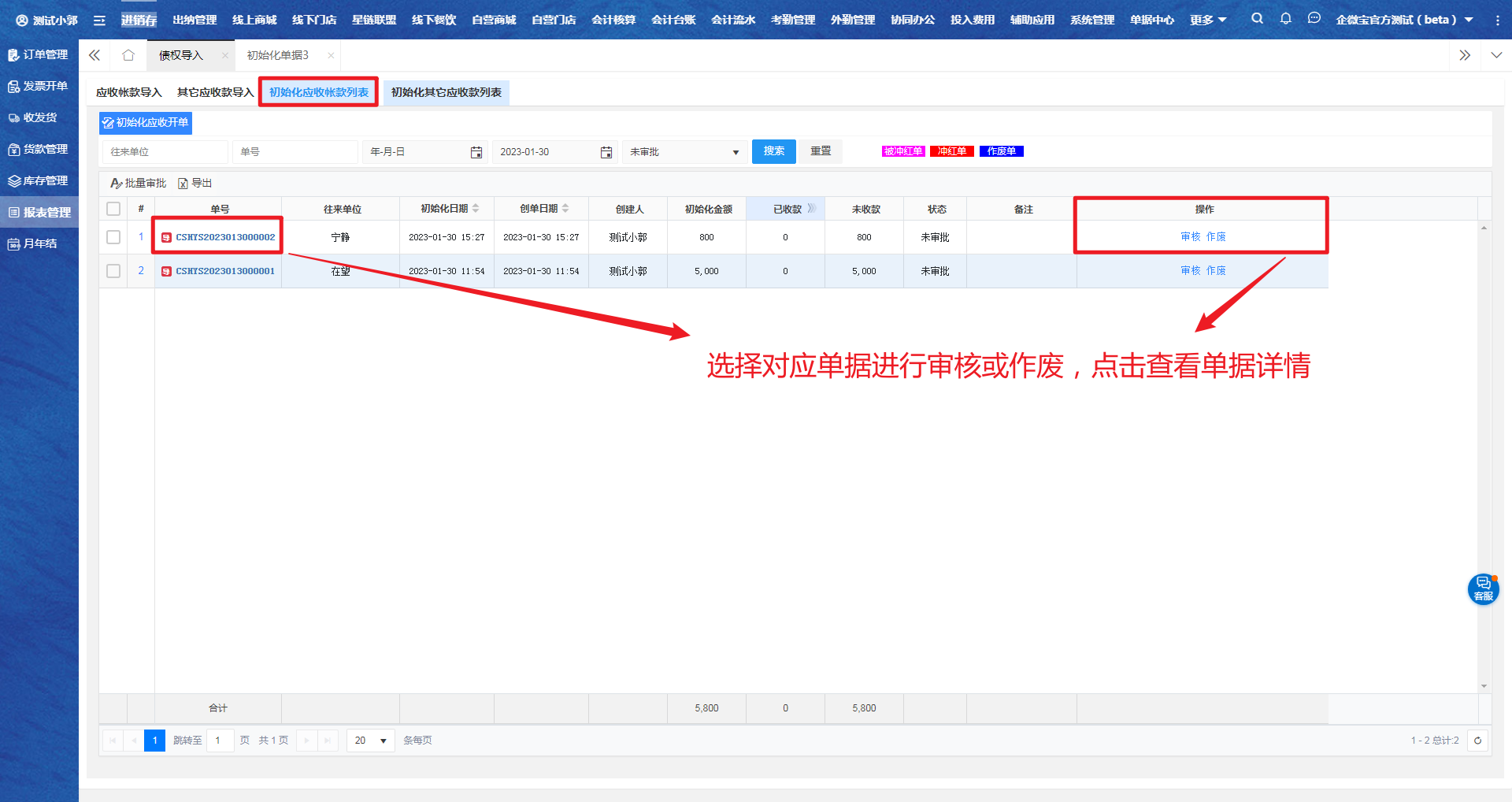 二、进入初始化应收账款列表,选择对应单据进行审核或作废操作;